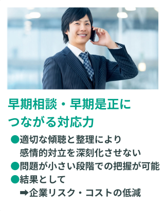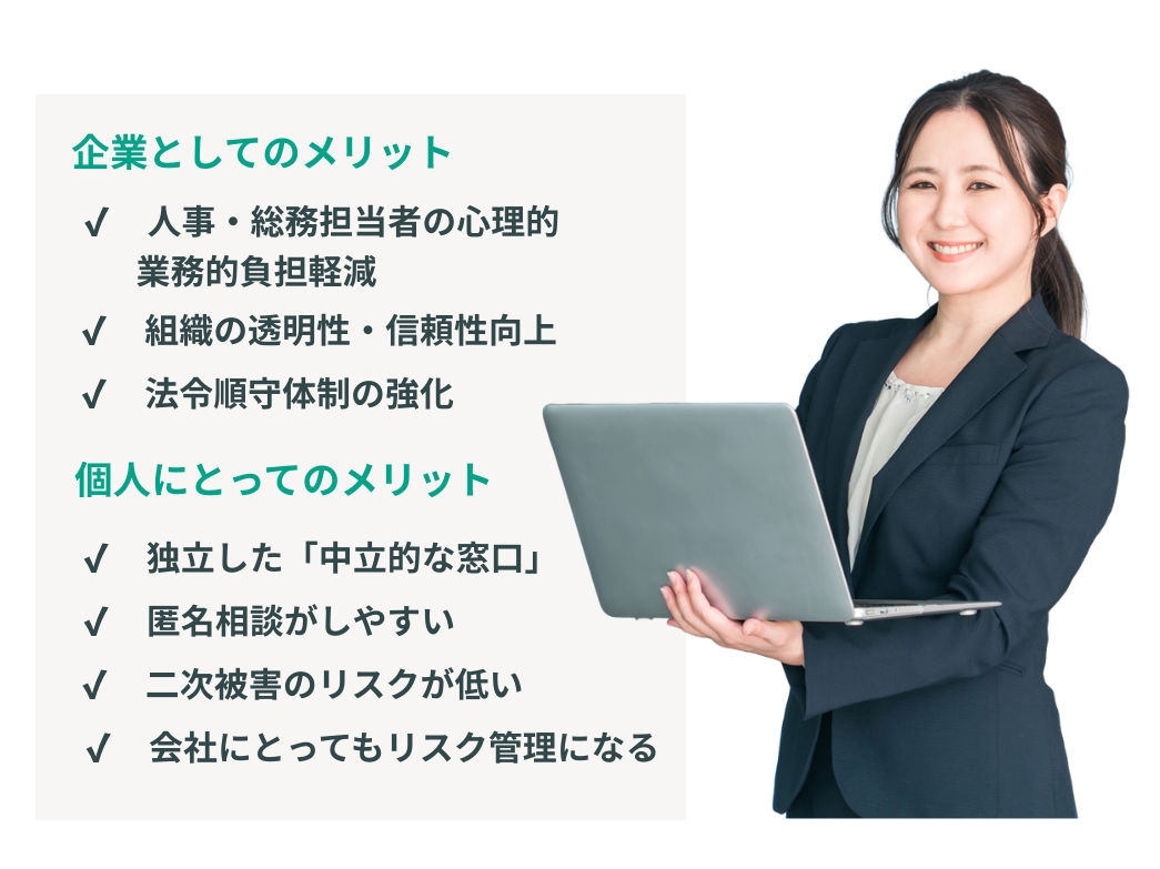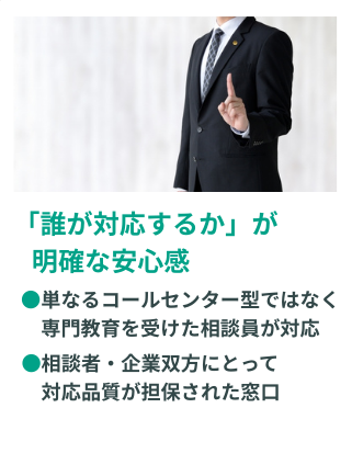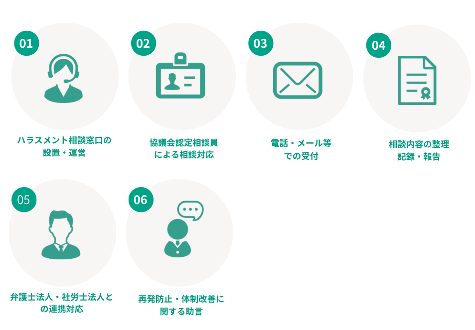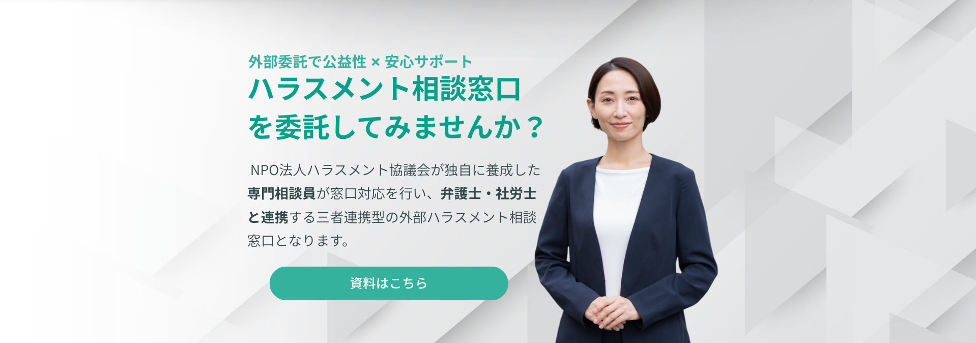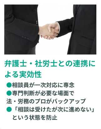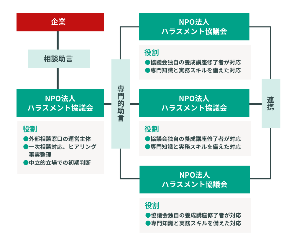NPO法人ハラスメント協議会は独自に養成した専門相談員が窓口対応を行い、弁護士法人・社労士法人と連携する三者連携型の外部ハラスメント相談窓口にて対応させていただきます。
